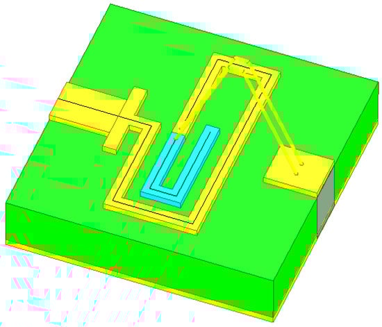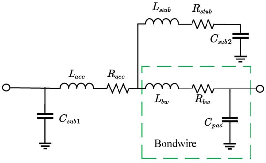 Figure 8 shows the equivalent circuit model of the gold-bonding-wire-spiral inductor composite structure. The inside of the green box is the equivalent circuit of the gold bonding wire part, and the outside is the spiral-inductor part.  and  represent the inductance and resistance of the accessed circuit part (yellow);  and  represent the inductance and resistance of the unaccessed circuit part (blue);  and  represent the inductance and resistance of the gold bonding wire part; and  represents the dielectric capacitance of each segment.  is the ground capacitance of the output pad. The equivalent circuit model of the gold-bonding-wire-spiral inductor composite structure has successfully realized the precise representation of the gold-bonding-wire-spiral inductor composite structure, so the equivalent circuit model can be used in the simulation of the internally matched power amplifier. Capacitor C is realized by thin-film circuit technology, and the substrate material is alumina ceramics with a relative dielectric constant of 9.9. The capacitance value of the parallel plate capacitor can be calculated by Equation (3):