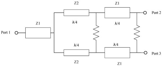 Figure 3 illustrates the basic circuit structure of a two-stage Wilkinson power divider, consisting of two power division branches and two isolation resistors. Each power division branch is composed of two sections of transmission lines with a length of , and each section has different characteristic impedances Z1 and Z2. Therefore, an impedance discontinuity is formed at the junction of each transmission line section. According to the theory of small reflections, the total reflected wave at the input port can be approximately viewed as the superposition of the reflected waves at each discontinuity as given in Equation (4):
