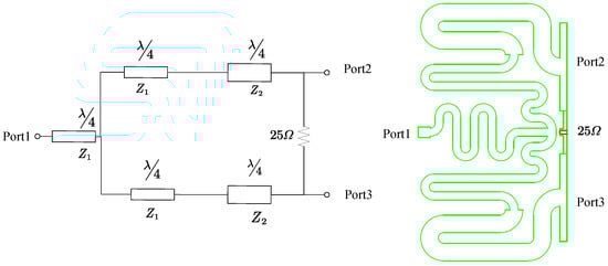 When considering transforming the impedance to another value between the ideal impedance of the matching network, the micro-strip lines with characteristic impedance  and  in the right part in Figure 9 should be changed to  and . The isolation resistor in the middle is removed for a compact layout design. Since the impedance at port 2 and port 3 have been changed to 12.5 , the isolation resistor value is set to 25 . Then, the structure of the power divider/combiner is changed into the structure as shown in Figure 10. Figure 10 also gives the layout of the power divider. To minimize the circuit size, the layout design of the power divider/combiner incorporates a large number of bends.