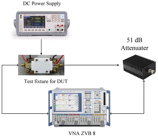 In order to figure out the small-signal performance of the designed PA, a test bed was used, which consists of Vector Network Analyzer ZVB 8 from Rohde and Schwarz, DC power supply, and 51 dB attenuator. The test bed setting is shown in Figure 13. The measured result is given in Figure 14. During the operation frequency, the proposed PA shows a stable small signal gain between 17 dB and 20 dB, which is lower than the simulation result. This may be caused by the accuracy of the GaN HEMT model, which will be further discussed in the next section.