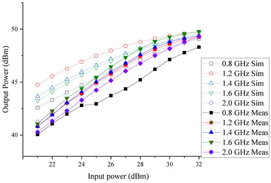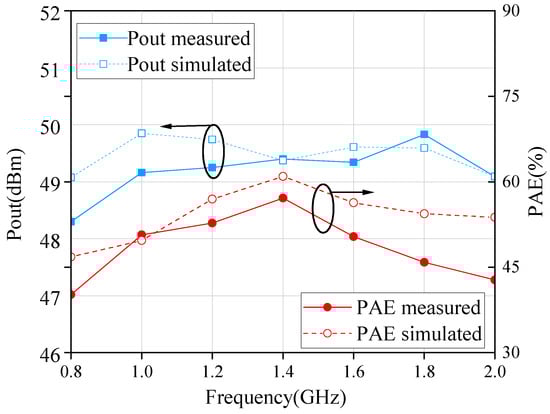 The drain voltage of the proposed amplifier is 50 V. The gate voltage is −0.235 V, and the test signal is a pulse signal with a duty cycle of 0.1. The output power and PAE results at different frequencies are shown in Figure 16. The minimum output power of the amplifier is 48.3 dBm at 0.8 GHz. The maximum output power is 49.83 dBm at 1.8 GHz. The output power is larger than 49 dBm except for 0.8 GHz. The minimum power additive efficiency is 40.18% at 0.8 GHz, and the maximum power additive efficiency is 57.1% at 1.4 GHz.