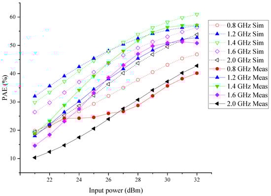 Figure 17 and Figure 18 show the power sweep measurement results and simulation results of the amplifier at 0.8 GHz, 1.2 GHz, 1.4 GHz, 1.6 GHz, and 2.0 GHz. The scanning input power is from 21 dBm to 32 dBm and the power step is 1 dB. It can be seen from Figure 17 and Figure 18 that the PAE and output power curves are close to the simulation shape at most frequencies. The performance degradation at the edges (0.8 GHz) of the frequency range is due to parasitic parameters of the circuit components. As given in Figure 17, the measured output power is lower than the simulation results. But when the PA comes close to saturation region, the power and simulation and measured result are more closed at most frequencies. This may caused by the accuracy of the GaN HEMT model, which may have less accuracy when the input power is lower. This can also be seen from the small-signal measurement results in Figure 14.