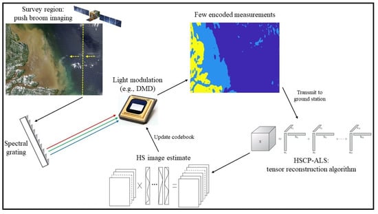 To overcome such constraints, the practice of compressive hyperspectral imaging was proposed to reduce the volume of collected data, drawing inspiration from the field of compressive sensing [4,5,6,7,8,9,10]. Unlike conventional data acquisition methods, these approaches simultaneously sample and compress HS images by modulating (or encoding) the incoming spectrum. The primary advantage of these novel methods is a significant reduction in the acquisition time and the volume of raw data collected. In this compressive HS imaging framework, dense on-site data acquisition can be alleviated by shifting the focus to large-scale optimization as a post-acquisition step to achieve data reconstruction (i.e., decoding). This acquisition regime is ideal for remote sensing situations, where hardware and transmission requisites are reduced and computational imaging can be achieved at a ground station (as illustrated in Figure 1).