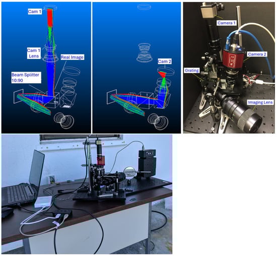 Our system uses a 260R Plane Ruled Diffraction Grating from the Richardson Grating Lab (Rochester, NY, USA) [46]. It has a nominal blaze wavelength of 500 nm, nominal blaze angle of 8.6°, and 600 grooves per mm. It is suitable for our desired spectral range of 400–800 nm, but our system will collect data that covers the 343–827 nm range. The incoming light collected through the imaging lens will propagate through a 10 m slit before reaching the diffraction grating to separate the light into different spectral components. The system Zemax optical model is shown in the top-left and middle images of Figure 2, while the bench setup is shown in the top-right image.