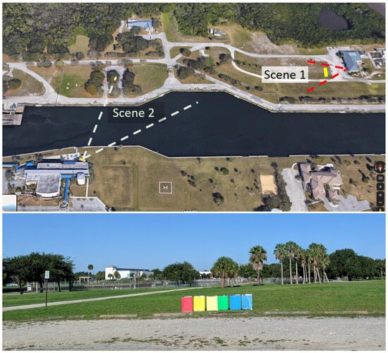 The system captured scenes at two locations on the Harbor Branch Oceanographic Institute campus (HBOI), as indicated in Figure 4 (top image). The target in Scene 1 consisted of six different color panels placed 10 m from the system (bottom image in Figure 4). The panels had dimensions 0.3 m × 0.6 m. In Scene 2, the system was mounted on the balcony of the second floor of the building to capture the channel. For this study, we only considered images collected from Scene 1.