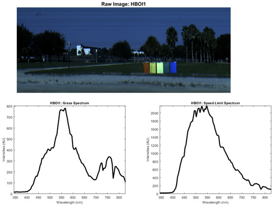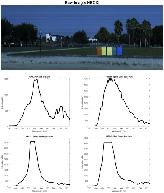Figure 5 and Figure 6 showcase two collected images, labeled as HBOI1 and HBOI2, respectively. The figures also illustrate sample spectral signatures from a grass pixel, the speed limit sign, the green panel, and the blue panel. Notice that the HBOI2 green and blue panel spectra suffer from oversaturation, i.e., the pixels exhibit blown out endmembers that were missing information of the peak wavelengths. This corruption was introduced as a mistake. During the initial data collection, HBOI1 was acquired at dawn with a properly determined shutter speed for the ambient light conditions. However, the authors neglected to readjust the shutter speed later in the day when HBOI2 was recorded with increased sunlight levels.