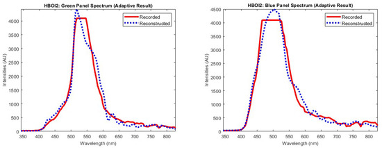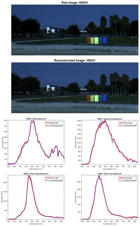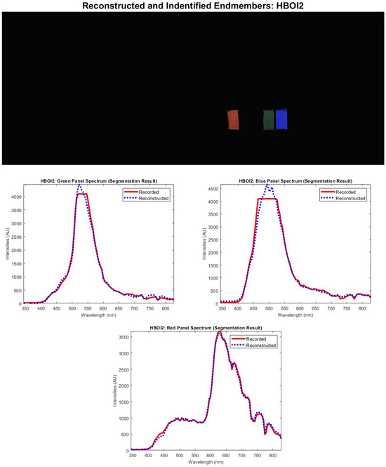 Hardware-based image segmentation results for HBOI2. (Top) Reconstructed HBOI2 pixels of target green, blue, and red panels. (Plots) Comparison of recorded vs. reconstructed spectra of green, blue, and red panels.