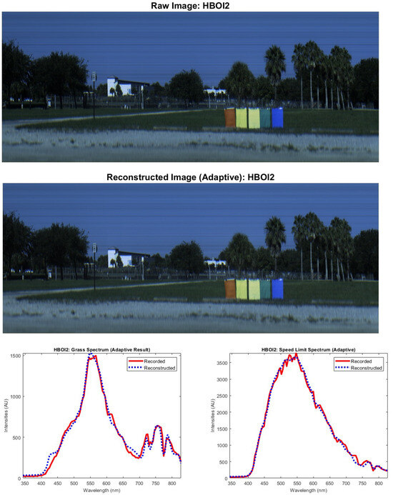 Adaptive sampling results for HBOI2. (Top) Raw HBOI2 image and (second row) reconstructed estimate of HBOI2 via adaptive patterns generated as in Section 2.4.2 (see right plot of Figure 7). (Plots) Comparison of recorded vs. reconstructed spectra of a grass pixel, the speed limit sign, the green panel, and the blue panel.