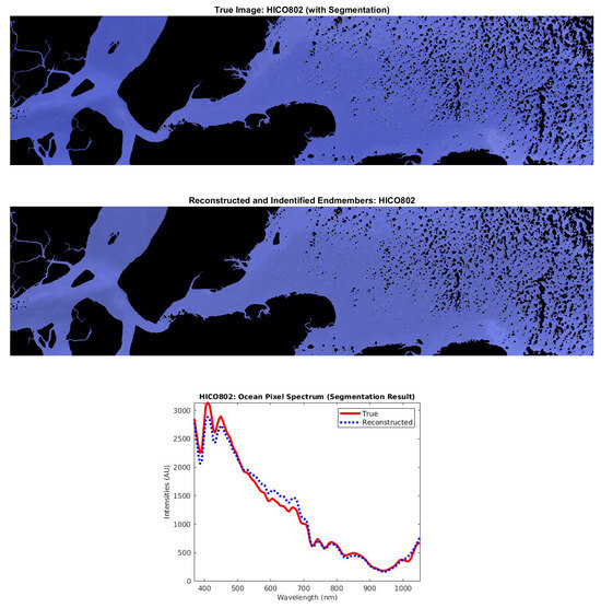 NASA HICO data: the same procedure was used to segment water-related pixels in the HICO satellite data. We considered two HS images labeled as H2011251110401 and H2010261105802, which we refer to as HICO401 and HICO802, respectively. These were images of the same river mouth region surveyed on different days. We truncated these cubes to be of size , removed corrupt pixels, and focused on the wavelengths 369.7–1051.3 nm. We used an HSCP-ALS reconstructed estimate of HICO401 as prior data (with a GPU-allowed rank ) that were synthetically encoded via patterns ( sampling) per pixel as in Section 2.4.1. We then selected several pixels from ocean and water regions of the image to generate the average and normalized signature and codebook as before (incorporating the all-ones pattern for normalization). -based sensing was applied to HICO802 ( sampling), followed by segmentation of the encoded image (as was done for the HBOI data). Finally, an HSCP-ALS estimate of the HICO802’s water pixels was produced with rank . The segmentation and reconstruction results are shown in Figure 12.