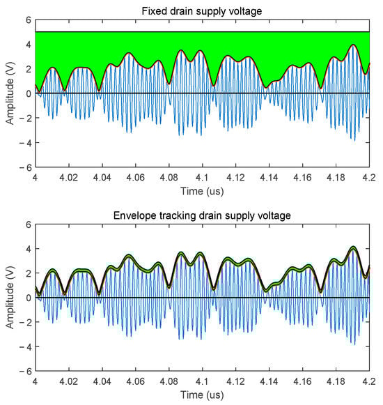 As the demand for data transmission rates continues to increase with modern communication technology, the increasing bandwidth and peak-to-average power ratio (PAPR) pose new challenges for the linearity and efficiency of power amplifiers. Envelope tracking (ET) technology is widely used, aiming to address this challenge by focusing on how to enhance the efficiency while ensuring the linearity of PAs [,,,]. Different from conventional power amplifiers with a fixed drain supply voltage, ET technology utilizes a dynamic drain voltage supply that tracks the envelope waveform []. As illustrated in Figure 1, where the green shaded region represents power losses on the power transistor, ET technology significantly reduces power dissipation on the power transistor, thereby improving efficiency [,,,]. HETSM, composed of switching converters (SWC) and LA and incorporating the advantages of both, has become the mainstream in research and applications and has been widely reported on in recent works [,,,,,,,,,,].