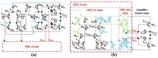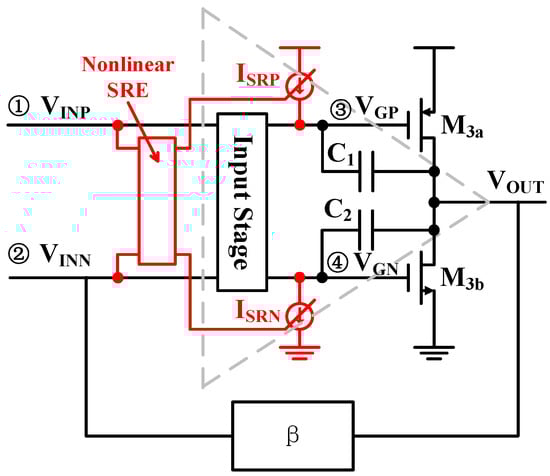 This paper proposed an LA design assisted by a nonlinear SRE structure, the diagram of which is shown in Figure 4. The nonlinear SRE structure is controlled by the input voltages,  and , whose inputs are connected to nodes ① and ②. The input voltage difference, , is converted into nonlinear SRE currents,  and , through the SRE structure. Due to the Miller compensation, the gates of the output transistors, nodes ③ and ④, become the slew-rate limiting points. Therefore, the output currents of the SRE structure,  and , are then injected into nodes ③ and ④, accelerating the charging or discharging process of the Miller capacitors ( and ).
