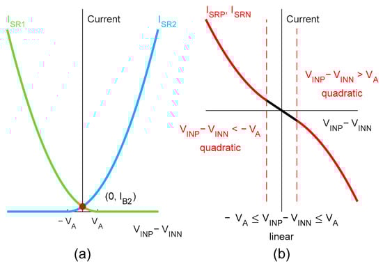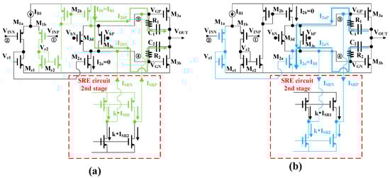 Then, in the second stage of the SRE circuit shown in Figure 5b, the primary SRE currents,  and , are amplified k times by current mirrors. Subsequently, they are subtracted to yield the output SRE currents,  and , as shown in Equation (11).