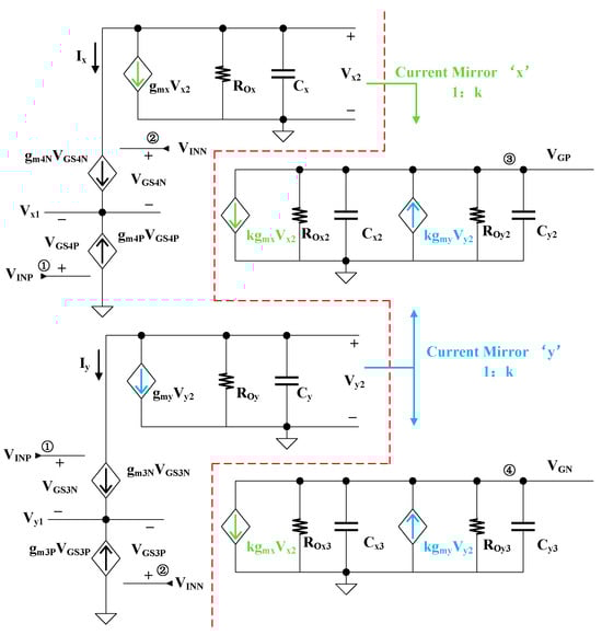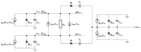 The small-signal model of the entire LA after the aforementioned simplification process is shown in Figure 10. If we incorporate the following steps into the LA design, we can achieve symmetry in the circuit to a large extent: