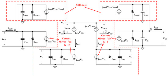 The SRE circuit in Figure 5b can be extracted to a corresponding small-signal model, as shown in Figure 8. In the small-signal models below, unless otherwise specified, , , and  are used to represent the transconductance , output resistance , and output capacitance  of transistor , respectively, where i denotes the subscript of the transistor. Due to the symmetrical design of the circuit, we have  and . The small-signal model in Figure 8 can be simplified to a one-stage amplifier model within the red dashed box in Figure 9. We can derive the relationship given in Equation (13):