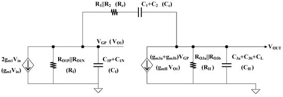 Then, due to symmetry, the LA circuit can be simplified to that shown in Figure 11. We find that the small-signal model of the proposed amplifier can be simplified to the well-known two-stage operational amplifier model, simply by substituting the parameters with those in parentheses shown in Figure 11. We can derive the relationship shown in Equation (15):