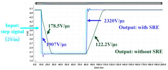 To better understand the effectiveness of the proposed SRE circuit, we compared the simulated LA performances with and without the SRE circuit. As shown in Figure 12, the proposed SRE structure increased the rise slew rate from  to  and the fall slew rate from  to .