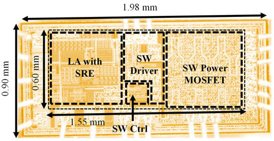 The proposed HETSM chip was fabricated on a 180 nm CMOS process, of which the die size was 1.98 mm × 0.9 mm, as depicted in Figure 14. The chip was operating under a 6.5 V power supply, with an off-chip inductor of 4.7 .