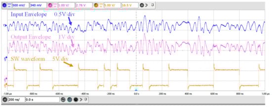 Figure 15 shows the measured waveforms for a 100 MHz signal, with a 16QAM modulation and an 8.49 dB PAPR. The external clock frequency was set to 20 MHz. The input envelope signal, output signal, and switching node voltage are shown in the figure. The HETSM amplified the amplitude of the input signal by a factor of 2, with an output signal delay of 7.5 ns.