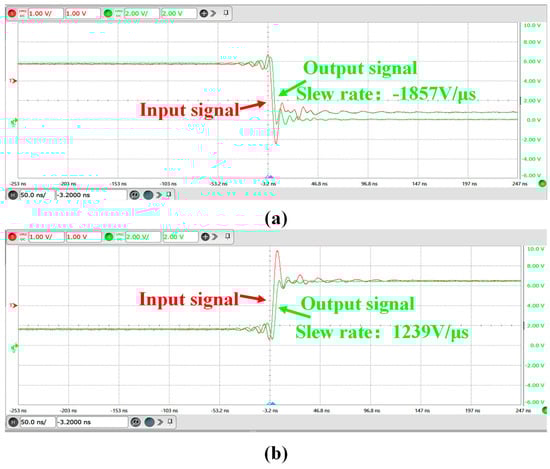 Measured step responses of the proposed LA with the SRE circuit: (a) fall condition and (b) rise condition.