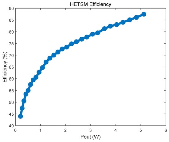 Figure 17 presents the measured efficiency of the HETSM chip with a 5  load paralleled with a 100 pF capacitor. For the 100 MHz, 16QAM, and 8.49 dB PAPR signal, the peak efficiency reached 87.4%. When the output power was small, the ratio of these intrinsic losses to the output power was relatively large. According to Equation (3), the efficiency was relatively small under low-power conditions for the large value of the aforementioned ratio, as shown in Figure 17.
