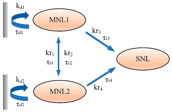 In Equations (1) and (2), the last term represents the mutual injection between MNLs, while the last two terms in Equations (4) and (5) denote the injection of the two MNLs into the SNL, respectively. can be written as follows []: