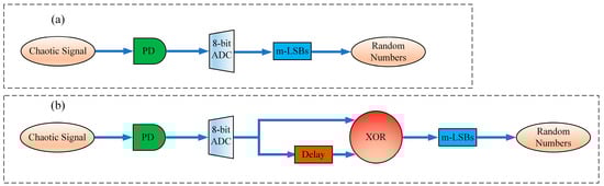 RNGs based on chaotic lasers mainly consists of three parts: a chaotic laser entropy source, acquisition devices, and post-processing. Extracting random numbers from the chaotic laser entropy source requires necessary acquisition devices. Typically, photodetectors (PDs) are used to convert chaotic light signals into electrical signals. Subsequently, these electrical signals are quantized using a 1-bit or multi-bit analog-to-digital converter (ADC) to generate random binary numbers. The raw signals generated by the chaotic entropy source may contain some biases and correlations, necessitating post-processing techniques to improve the quality and randomness of the generated random numbers. We proposed two different post-processing schemes, as shown in Figure 2, and explored the influence of different post-processing approaches on extracting random sequences. In Scheme 1, the random sequence is obtained by directly extracting the least significant bits (LSBs) from the binary sequence quantized by an 8-bit ADC. Scheme 2 introduces exclusive-OR (XOR) operation, combining the unshifted sequence with the shifted sequence using XOR to form a new sequence. The final random sequence is obtained by retaining the LSBs.