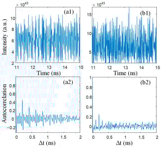 To analyze the concealment performance of TDS, we use the ACF for analysis. The smaller the ACF value, the better the TDS concealment performance. When it is less than 0.2, it is generally considered successful in suppressing TDS. Based on previous research, it was found that NLs only under optical feedback cannot entirely conceal the TDS. Therefore, we explore the influence of increasing mutual injection strength on TDS concealment of MNLs under fixed feedback parameters. Under the fixed feedback parameter we compared the time series and ACF of the output from MNLs when the mutual injection strengths were and . Figure 3a depicts that, when the mutual injection strength is , corresponding to the case where MNLs are only under optical feedback, there is a clear TDS. Figure 3b illustrates that, when the injection strength increases to , the oscillation range of the chaotic signal expands, and the TDS is significantly suppressed but still noticeable. This indicates that larger injection strength may help hide the TDS of MNLs.