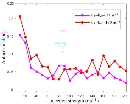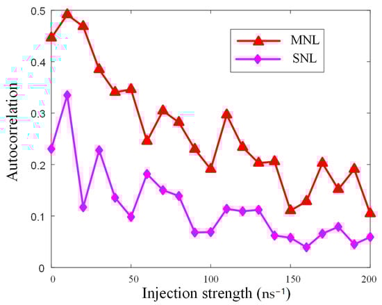 To further analyze the TDS concealment performance of the SNL, we studied the trend of the peak values of the ACF of the SNL with varying injection strengths from the MNLs. This includes scenarios where the MNL output signals exhibit significant TDS and where TDS is completely suppressed. From Figure 4, it is evident that there is a noticeable TDS when the mutual injection strength between the MNLs is , while, when the mutual injection strength is , the TDS is completely suppressed. From Figure 5, it can be observed that, when the MNLs exhibit significant TDS, the value of the ACF drops below 0.2 when the injection strength from the MNLs to the SNL exceeds . When the TDS of the MNLs is significantly suppressed, the ACF remains below 0.2 across the entire range of injection strengths. This indicates that the TDS of the SNL can be effectively suppressed, with a more pronounced effect when the TDS of the MNLs is completely suppressed and injected into the SNL.