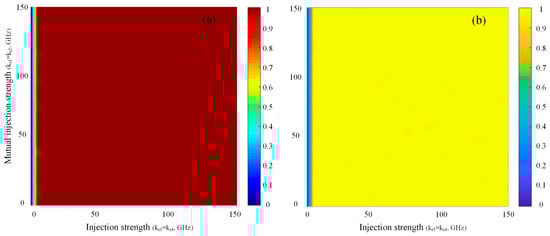 The advantage of physical random numbers lies in their genuine unpredictability, and the unpredictability of random numbers lies in the inherent characteristics of their generation method. Therefore, the complexity of the output signal from a chaotic entropy source determines the randomness of the random sequence. The 0–1 chaos test is a numerical method used to determine chaotic behavior []. The 0–1 chaos test analyzes time series data by calculating a statistic called the 0–1 measure. If the value of the 0–1 measure is close to 1, it indicates that the system exhibits chaotic behavior; if the value is close to 0, it suggests that the system is quasi-periodic or stable. PE [] is a tool used for time series analysis that measures the complexity of a time series to determine the dynamical characteristics of a system. Because it is robust to noise and computationally efficient, PE is particularly well-suited for handling data from nonlinear and chaotic systems. Low PE indicates that the time series has high predictability, suggesting that the system may be quasi-periodic or deterministic. High PE indicates that the time series has high complexity, suggesting that the system may be random or chaotic. Figure 6a depicts the chaotic region of the SNL output, showing that the SNL operates in a chaotic state across almost the entire parameter range. This is because the MNLs operate in a chaotic state solely under the influence of optical feedback. The chaotic signals are further enhanced through mutual injection between the MNLs and additional injection into the SNL. Figure 6b shows the complexity region of the chaotic signals of the SNL output, which is consistent with the chaotic region. Highly unpredictable chaotic signals can be output across nearly the entire parameter range. This lays the foundation for extracting high-quality random numbers in subsequent steps.