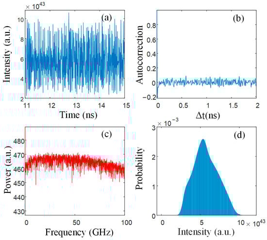 TDS and unpredictability are important factors affecting the quality of random numbers. Similarly, the bandwidth and statistical properties of the chaotic laser entropy source also have significant effects on random number extraction. The bandwidth of the chaotic entropy source determines the generation rate of random numbers, while the statistical properties determine the statistical characteristics of the random sequence. While ensuring complete hiding of the TDS, adjusting relevant parameters to maximize bandwidth and ensure the chaotic entropy source possesses favorable statistical properties. The specific parameter settings are as follows: . Figure 7 shows the time series, ACF curve, power spectrum, and amplitude distribution of the chaotic entropy source under the aforementioned parameter settings. The chaotic system outputs chaotic signals with large amplitude fluctuations and completely suppression of the TDS. The effective bandwidth is approximately 100 GHz, and the statistical properties closely resemble an ideal Gaussian distribution.