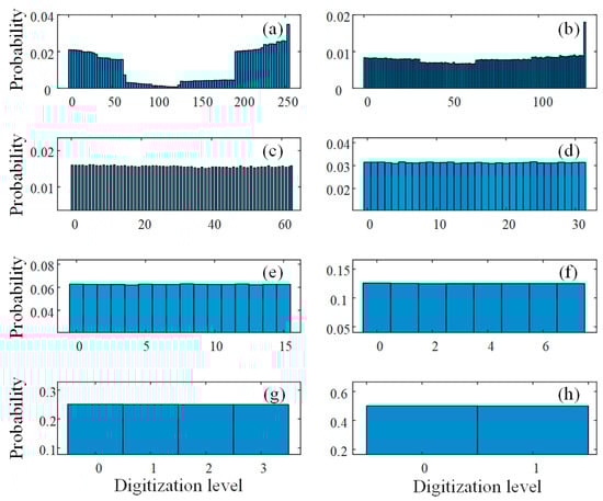 The amplitude distribution when retaining m-LSBs in Scheme 2: (a) m = 8; (b) m = 7; (c) m = 6; (d) m = 5; (e) m = 4; (f) m = 3; (g) m = 2; (h) m = 1.