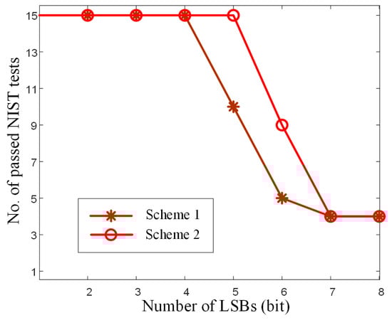 The number of NIST subtests passed when retaining eight to one LSBs in Scheme 1 and Scheme 2.