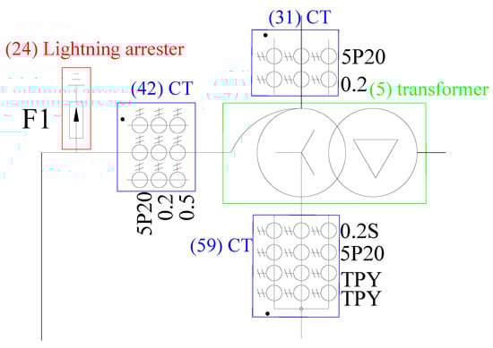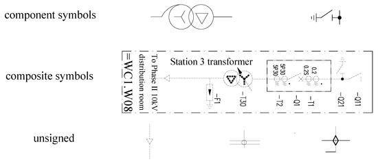 Firstly, the dataset undergoes symbol cropping. This dataset comprises two parts: the component symbol dataset and the composite symbol label dataset. We extract these from the collection of electrical main wiring drawings at the substation, marking all component symbols and their composite symbols in each electrical main wiring diagram. Given the significant differences between component symbols and composite symbols in the drawings, we choose an appropriate pixel window for individual marking and cropping of all electrical main wiring diagrams. Additionally, addressing situations where some drawings lack corresponding equipment text labels for component symbols or where their semantics cannot be clearly identified, we establish an “unsigned” cropping dataset to store cropped images in such special cases, as shown in Figure 2.