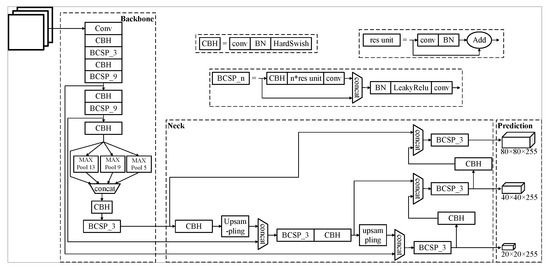 In the Neck section, the network structure integrates the advantages of Feature Pyramid Networks (FPNs) and Path Aggregation Network (PANs). The FPN structure propagates high-level feature information in a top-down manner, transmitting strong semantic features through upsampling, and then integrates with the PAN structure, which can transmit strong localization features in a bottom-up manner. Through the combination of these two structures, feature fusion is performed on different feature layers of the Backbone and different detection layers, enhancing the network’s ability to extract features related to graphical symbols.