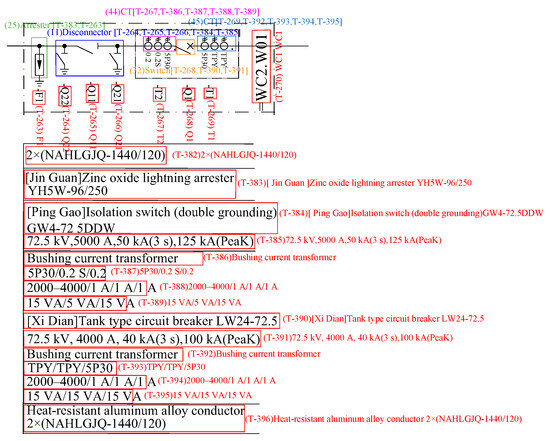In the electrical primary wiring diagrams of substations, textual elements play a crucial role. They identify and describe various electrical equipment types, voltage levels, and design annotations within the drawings. These texts typically include the names of devices and the parameters of the devices in parameter tables placed next to the electrical equipment. Together, this information clearly defines the engineering and parameter details of the electrical equipment. Therefore, the accurate identification and parsing of these texts, along with the correct association with recognized component symbols on the drawings, are essential for the automatic extraction of key parameters in the GIM. The lack of this step would significantly reduce the extraction effectiveness.