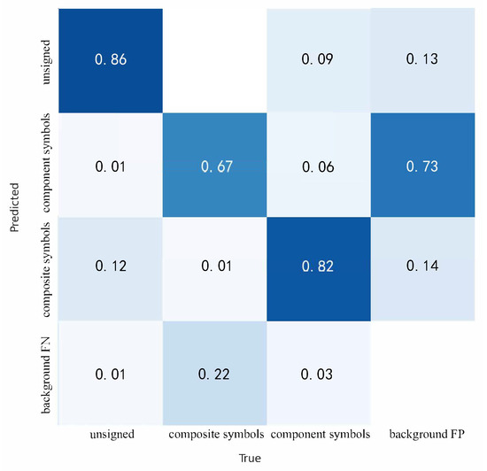 The confusion matrix in Figure 8 presents the confusion matrix of the recognition system, reflecting the recognition performance and confusion degree of different symbol categories. The recognition of unsigned and component symbols is less affected by interference and is not easily confused with the background or other categories. This indicates that the features of these two types of symbols are more distinct and less affected by background interference. Therefore, we can conclude that the feature extraction and classification algorithms for unsigned and component symbols are highly reliable in practical applications. On the other hand, composite symbols easily interfere with the background, with a probability of 22% of being misclassified as background. This higher misclassification rate suggests that the features of composite symbols are more easily confused with background features, leading to lower recognition accuracy. This may be due to the complex structure of composite symbols and the diverse background environments.