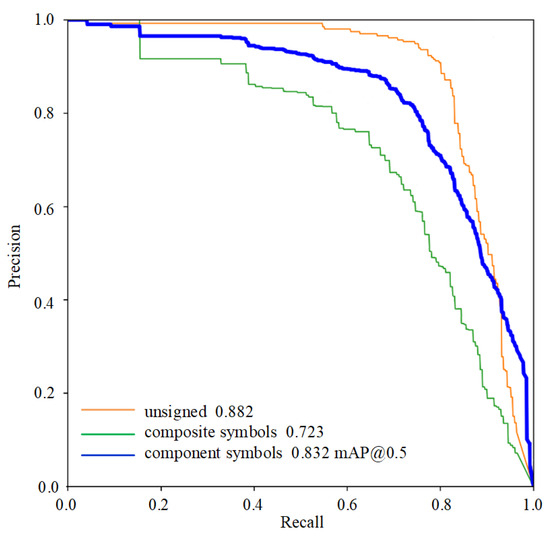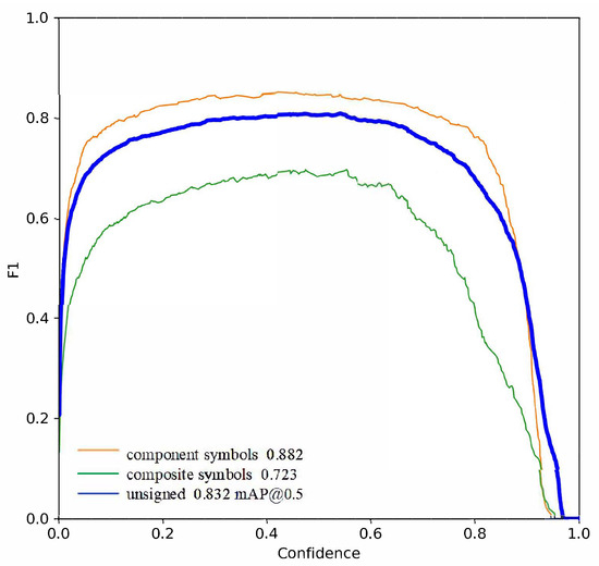 To measure the robustness of the model, we drew the F1-score curve based on the harmonic mean of precision and recall. As shown in Figure 10, the F1 curves for unsigned, combination symbols, and element symbols all performed well and were not significantly affected by the imbalance of the circuit diagram dataset. This indicates that the model has good robustness and overall performance.