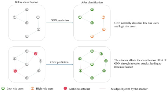 However, GNNs have been proven to be susceptible to adversarial injection attacks [5], which aim to deceive the model during the training phase by injecting maliciously crafted data to mislead the learning trajectory. These attacks have revealed GNN vulnerabilities, especially when facing carefully designed malicious modifications [6]. A common threat posed by adversarial injection is the ease with which such models can be misled by nuanced alterations to the graph data, such as the addition of nodes or edges, potentially leading to misclassification. In practical scenarios, a key challenge faced by defenders is the inability to fully observe the overall state of the graph. These malicious attacks may be difficult to detect directly because the defenders cannot know exactly which nodes or edges have been compromised. This partial observability makes designing effective defense strategies more complex. For example, a financial system that incorrectly categorizes high-risk individuals as low risk due to such manipulations may fall prey to fraudulent activities. As shown in Figure 1, prior to any attack, the risk assessment system is capable of accurately evaluating user risk levels, effectively distinguishing between high-risk and low-risk users. However, following an adversarial injection attack, wherein attackers manipulate data by transacting with or establishing associations with other users, the model becomes predisposed to erroneously assessing the user’s risk level, and it is difficult to detect the attackers, thus successfully compromising the integrity of the assessment.