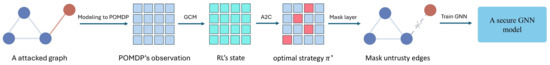 To address these challenges, we propose a secure training approach for GNNs based on reinforcement learning. Figure 2 is an illustrative example of our secure training process. First, we cast graph security issues as a Partially Observable Markov Decision Process (POMDP). POMDPs facilitate the management of the indeterminacies that stem from attacker actions and system state ambiguities. We then employ Graph Convolutional Memory (GCM) to restructure POMDP observations into states with embedded temporal memory, setting the stage for reinforcement learning algorithms to derive an optimal defensive strategy. Our solution features a custom convolutional scope controlled by a unique mask layer preceding convolutional layers, fostering a more secure GNN framework. Experimental results show the efficacy of our method via evaluation on four citation networks and one social network dataset, with accuracy improvements of approximately 0.82% to 100.26% over comparable adversarial defense models. Furthermore, precision-based assessment showcases both the accuracy and security topologies facilitated by our defense mechanism on original, post-attack, and post-defense data.