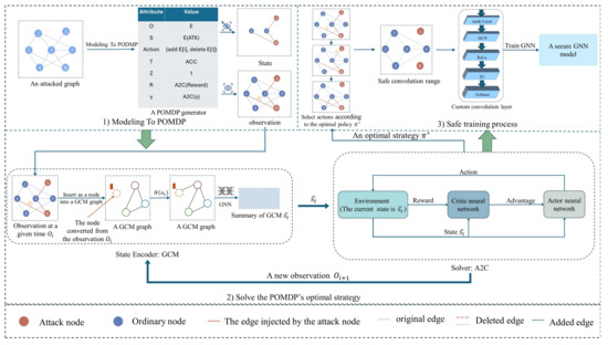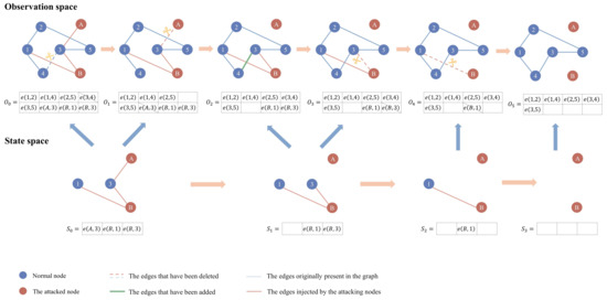 Specifically, we first model the graph security issues as a POMDP model. For a graph , after being attacked, the initial state is the disturbance added by the attack node x, but both the attack node and the disturbance are unknown. The observation o is known; it is the set of edges between nodes in the graph, and the initial observation includes the edges injected by the attack nodes. We attempt to change the state s by taking the action to add or remove an edge in the graph. If the operated edge is one injected by an attack node, then the state s will change. Moreover, each action taken will lead to a transition from the observation to .