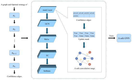In the previous section, we have obtained an optimal strategy through reinforcement learning algorithms. Now we need to use this strategy to train the GNN network. As shown in Figure 6, we have added a custom mask layer before the GCN convolutional layers. The mask layer provides a mask value for each edge, which allows us to control the convolutional range of the GNN by changing the mask values. In the process of solving the optimal strategy previously, the modification of edges was achieved by modifying the mask value. Therefore, changes to the edges must go through the mask layer in order to be effective. For example, if the mask value corresponding to an edge is 0, then the GNN will not convolve this edge, effectively deleting it. If the mask value is 1, the convolution process will operate on this edge as usual. As illustrated in Algorithm 2, with the optimal strategy, we can obtain a set of trustworthy edges, meaning that when the connections between the nodes in the graph are all secure, we can set the values of the mask to control the convolutional range of the convolutional layer. By preventing the convolutional layer from learning dangerous edges, we achieve a safe GNN.