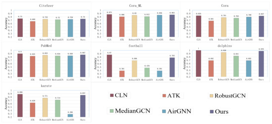 As shown in Figure 7, CLN is the original model accuracy, ATK is the post-attack accuracy, and the other four are the accuracies of different defense methods. It can be found that, after defense, the performance is improved to different degrees compared with the attack, but the accuracy is slightly lower than that of the original model. This may be because the model cannot fully consider all adversarial examples and still lacks the ability to detect some adversarial examples with high concealment. For Adv Injection attack methods, Robust GCN, Median GCN, and AirGNN all provide relatively strong protection capabilities. Comparatively speaking, our method can effectively improve the security of the adversarial injection attacks of the GNN model. Our defense approach achieved 74% to 86.7% accuracy, an improvement of about 5.09% to 100.26% compared with post-attack accuracy, and about 0.82% to 100.26% higher accuracy than several other models.