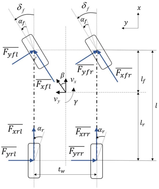 where denotes the longitudinal velocity; the lateral velocity; the yaw rate; the lateral acceleration; the front wheel steering angle; the mass of the vehicle; the sprung mass; the distance from the center of gravity to the front/rear axle; the wheel base; the tread (track width); , the longitudinal forces of the front/rear wheels; the lateral forces on the individual wheels; the yaw moment of inertia about the z-axis; the roll moment of the inertia about the x-axis; and the damping ratio and stiffness of the suspension; the roll angle of the sprung mass; and the anti-roll moment exerted by ARC. The longitudinal forces and the steering angle are used as the control input in the controller design in the following sections.