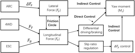 To exploit the over-actuated characteristics of the chassis to push the tire forces to the limit in emergency turning, the effects of different control modules on the vehicle dynamics, particularly on yaw motion, should be taken into consideration, as shown in Figure 4.