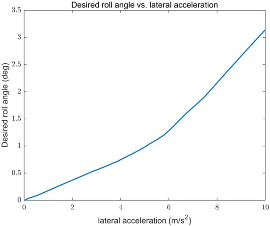When the vehicle negotiates a corner, a rolling moment is generated by the centrifugal force at the center of mass, and then the passive reaction forces of the suspension start to resist the rolling motion. The desired roll angle of the ARC system can be acquired based on the lateral acceleration [23], and the relation between the desired roll angle of the ARC system and the lateral acceleration is shown in Figure 7.