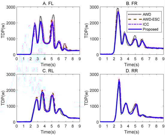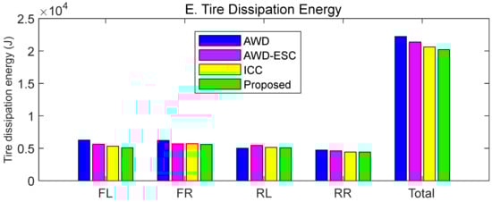 The TDEs of each tire and the overall values were calculated, as shown in Figure 11 and Table 2. In Figure 11 and Table 2, the TDE of the proposed algorithm was the smallest of the four systems, and the dissipation energy distributed to the four tires was roughly even, which is exactly the aim of the algorithm, i.e., reducing excessive tear and wear on one tire. The TDE of AWD-ESC was smaller than that of ICC mostly due to the relatively low vehicle speed, while the AWD system was remarkably larger than the other three systems owing to the instability of the vehicle.