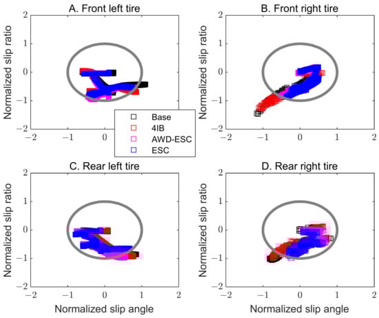 As shown in the figure, the trajectories of the four controllers were basically identical except from the slight deviation of the ‘Base’ controller, which indicated the excessive slip motion of the tires in ‘Base’ controller, as can be seen in Table 5. On the other hand, Figure 16d shows the longitudinal acceleration of the four controllers, in which the one of the proposed controller was evidently larger than that of the other controllers, and similar observations could also be made in the result of the lateral acceleration, as shown in Figure 16e. Larger longitudinal and lateral accelerations allow for a larger overall longitudinal velocity, which implies a capability of decelerating later in cornering and accelerating faster in straight-line driving. This implication can be demonstrated by the overall lap time listed in Table 5, which was as near as 3.8% of reduced lap time when using the proposed controller, and it can be easily observed compared with that of the ‘AWD’ system.