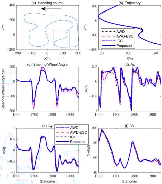 The controller was further tested to verify the comprehensive performance. A handling course was chosen as the target path profile, as shown in Figure 16a, where the black arrow points to the running direction. In this test, the major target of the controllers was to finish the course in the minimum time without losing stability. To do so, an advanced driver model, which was developed in previous research [33], was adopted here to generate the race-car driver performance. The simulation was conducted on the entire handling course while we selected a representative part (shown surrounded by a black square in Figure 16a) to analyze the performance of each controller more closely. The main results regarding trajectory, steering wheel angle, longitudinal/lateral acceleration, and the longitudinal velocity are illustrated in Figure 16. As the comprehensive test was performed to measure the overall performance, the shortest lap time served as the main performance index. The results of the best lap time of the four controllers together with the corresponding TDE values are listed in Table 5.