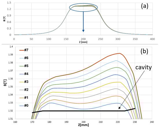 The gyrotron’s solenoid was simulated (in CST studio 2023) for eight different profiles of the magnetic field (Figure 1). The magnetic field was slightly modified starting from zero gradient (with 0.5% homogeneity, curve #0) up to a maximal gradient, considering a feasible magnetic field profile that can be obtained by slightly changing the solenoid through adding windings in a correction solenoid.