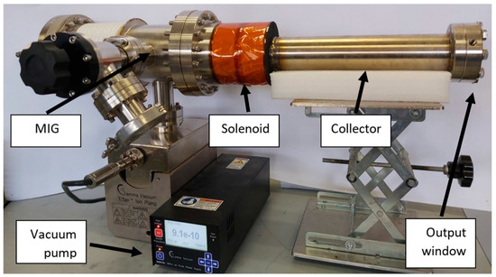 The gyrotron was operated with a pulsed ~1.3 T magnetic field (the solenoid pulse duration was ~40 ms [23]) radiating in the Ka-band. It should be noted that a used magnetron injection gun (MIG) in a triode configuration was taken from the gyrotron tube in ref. [24] and few adjustments were made. Therefore, the gun was not fully compatible with the tube and reduced the fundamental electron efficiency of the tube. The setup parameters are detailed in Table 1, and a picture of the gyrotron is seen in Figure 3.